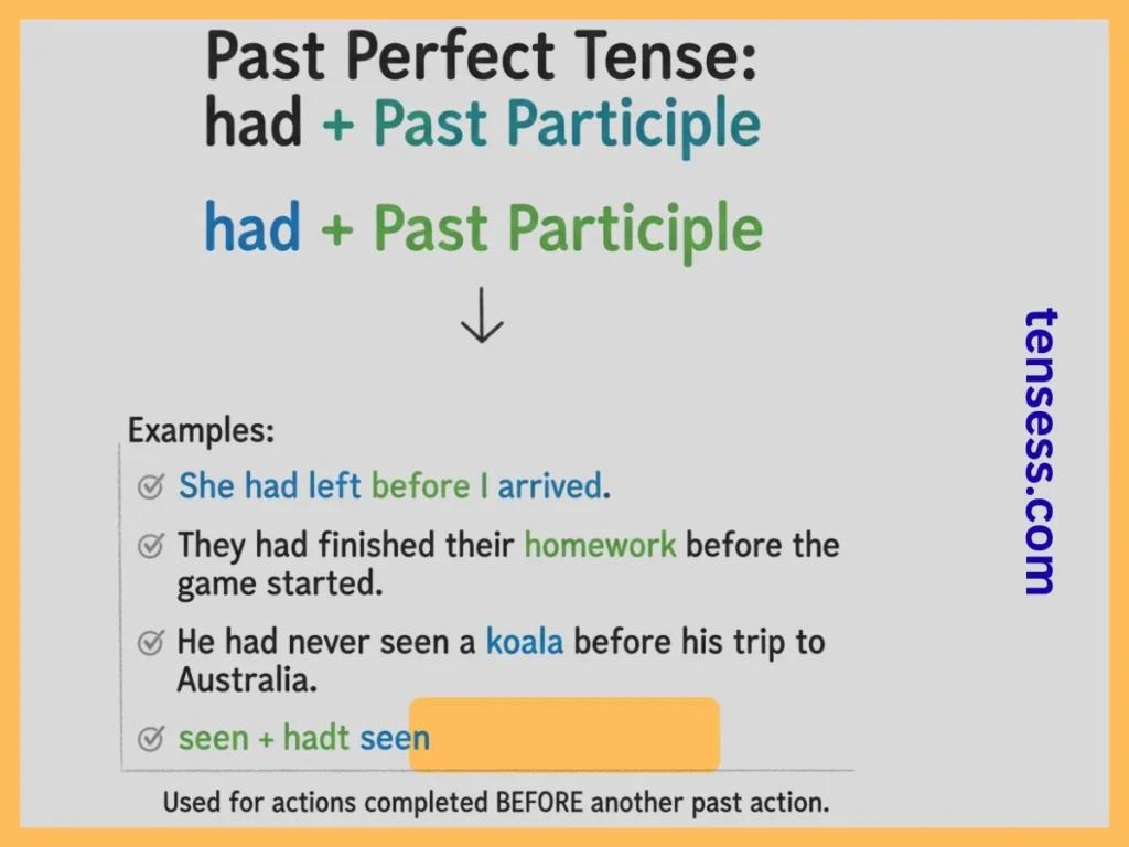 To spot the past perfect tense, look for the structure had + past participle. The word had signals the tense, and the past participle (e.g., written, eaten, gone) indicates the completed action. It often appears in sentences with time markers like before, after, by the time, or when. For instance, “She had left before I arrived.” The past perfect tense is distinct from the simple past (e.g., “She left”) because it emphasizes an action completed earlier in the past.