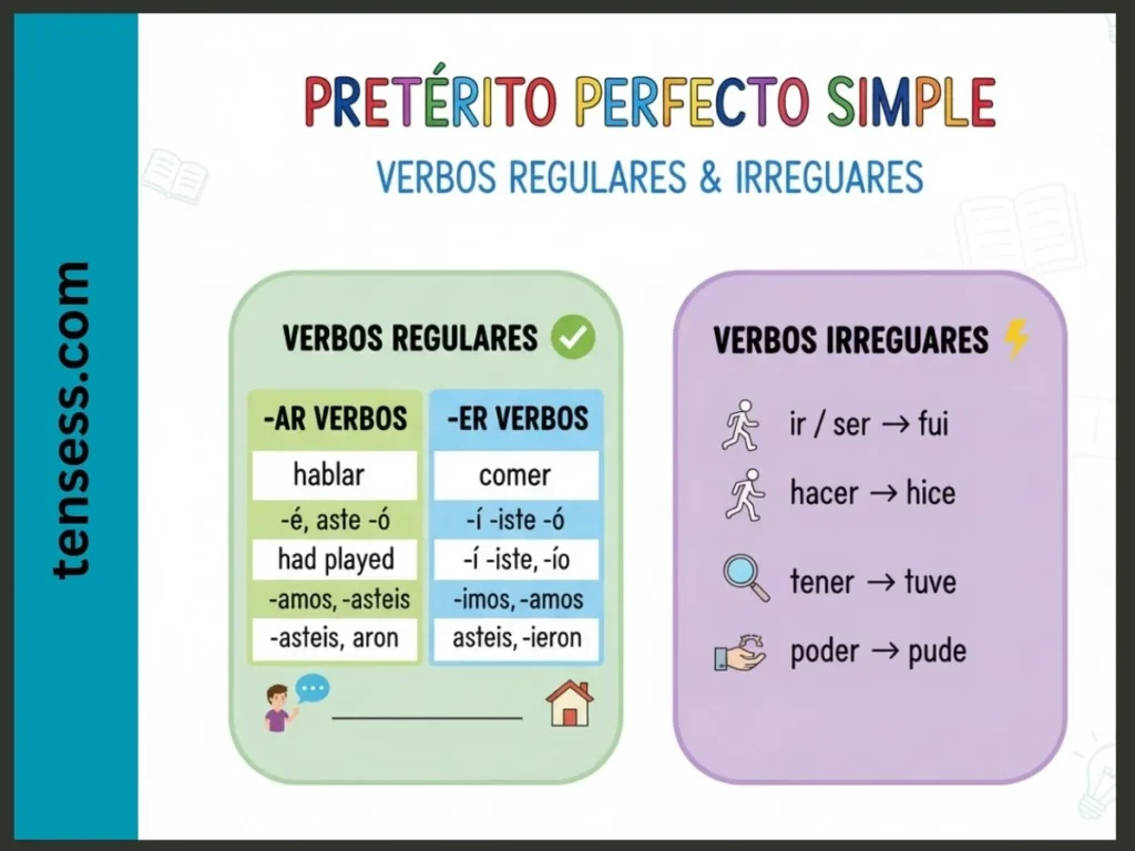 The preterite tense applies to both regular and irregular verbs. Regular verbs follow predictable patterns, while irregular verbs (like ser, ir, or tener) have unique forms. Let’s break down the conjugation rules.